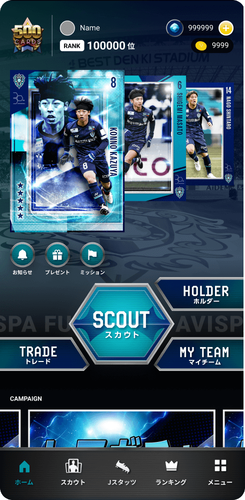スカウトを行うことで豪華デザインのデジタルカードをGET。集めたカードは他のユーザーとトレードも可能。選手たちの様々なシーンを切り取ったカードを集めよう。