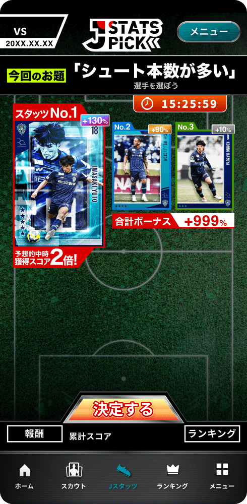 試合ごとに出題されるテーマに沿って、活躍しそうな選手を予想する「Jスタッツピック」 見事的中すれば、ゲーム内スコアを獲得。 集めたスコアは、限定カードなどの豪華報酬と交換可能です。 試合の展開を予想して、戦略的にスコアを集めましょう。
